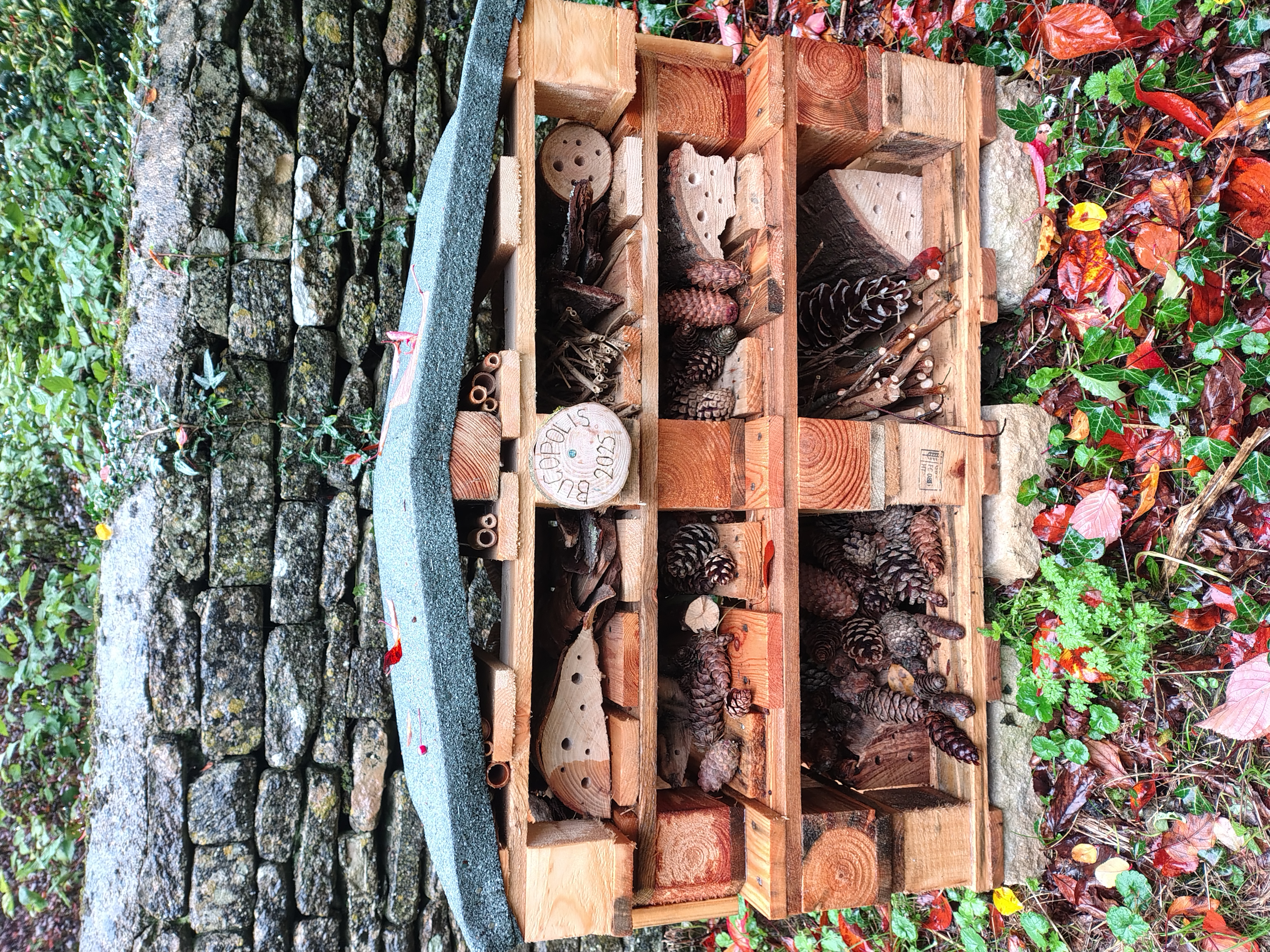 In September 2025 we built a bug house using reclaimed materials. As part of our Source service for Creationtide, we filled it with logs, sticks and other materials to create a shelter for overwintering invertebrates and small animals. We asked people to suggest a suitable name for it and Bugopolis was the one we chose.